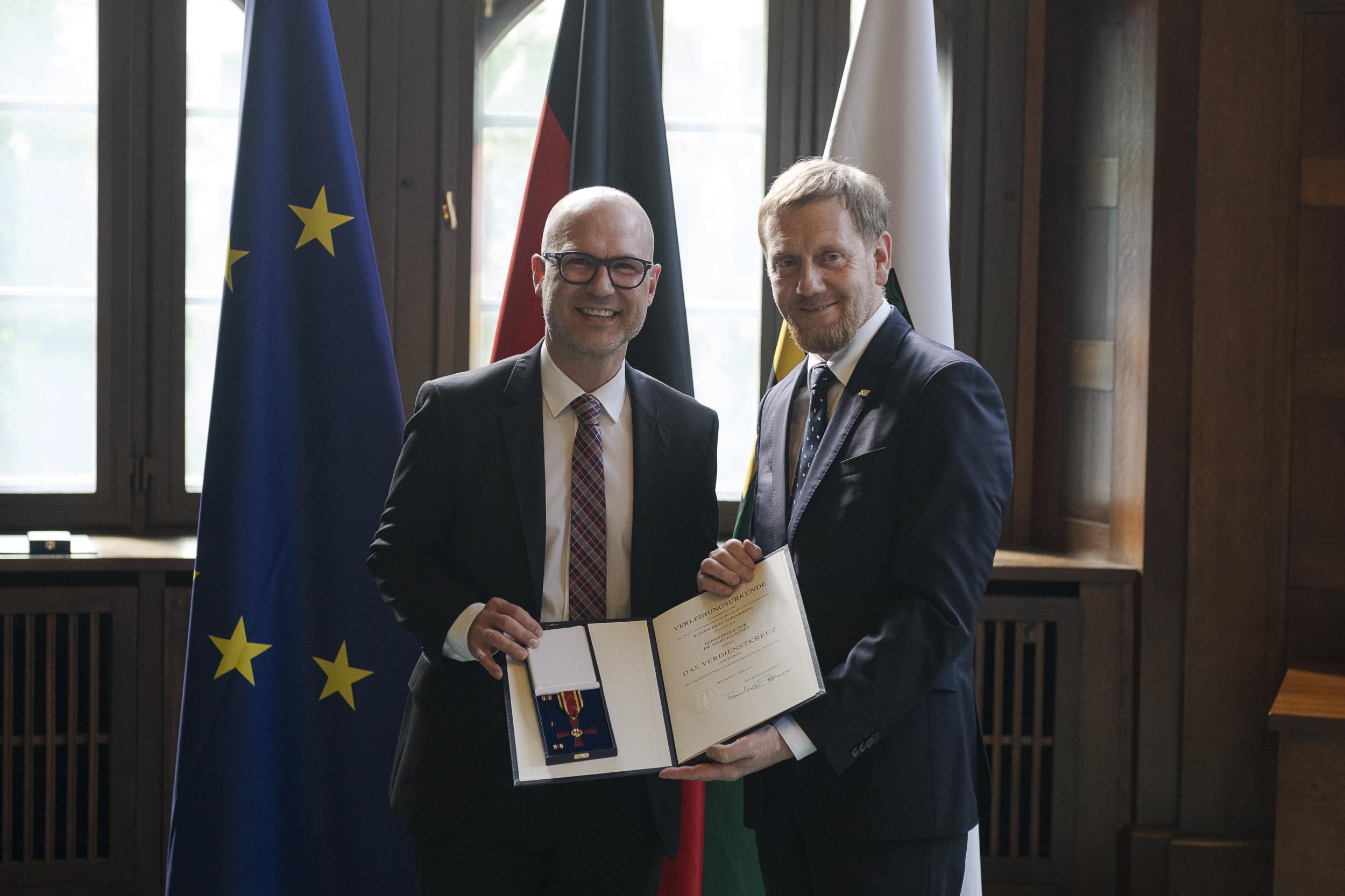 Am 27. Mai 2025 überreichte der sächsische Ministerpräsident Michael Kretschmer den Verdienstorden der Bundesrepublik Deutschland an Prof. Dr. Martin Lacher, Direktor der Klinik für Kinderchirurgie am Universitätsklinikum Leipzig.